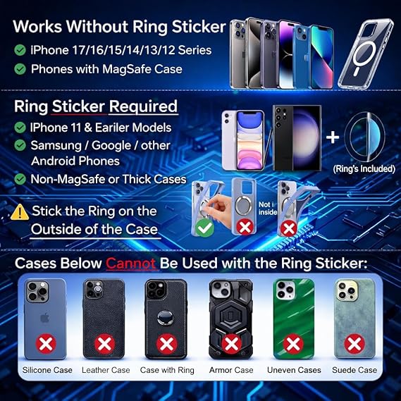 - Non-MagSafe Phones: Use the included metal ring for compatibility.